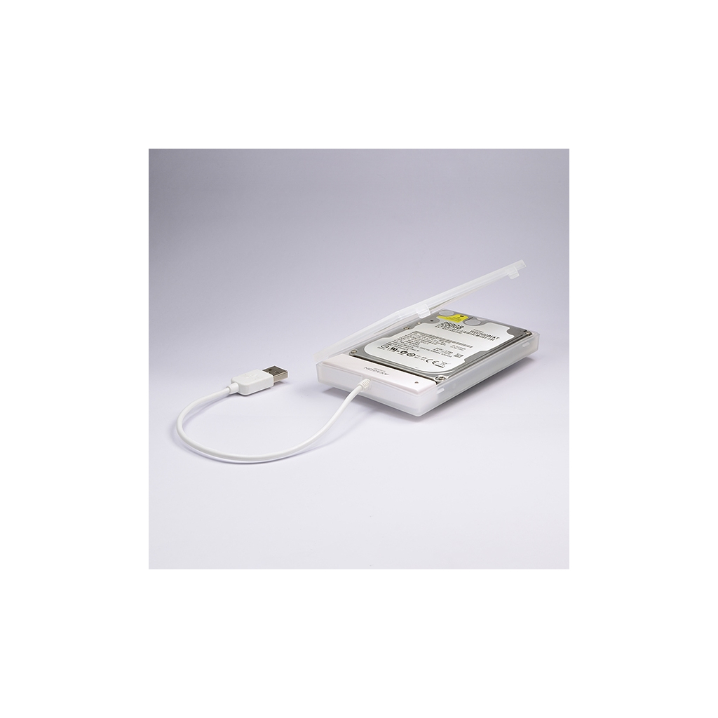 jednoduché plastové pouzdro pojme 2.5" disk výšky max. 9.5mm s připojeným USB adaptérem (USB kabel je vyveden otvorem v pouzdře)