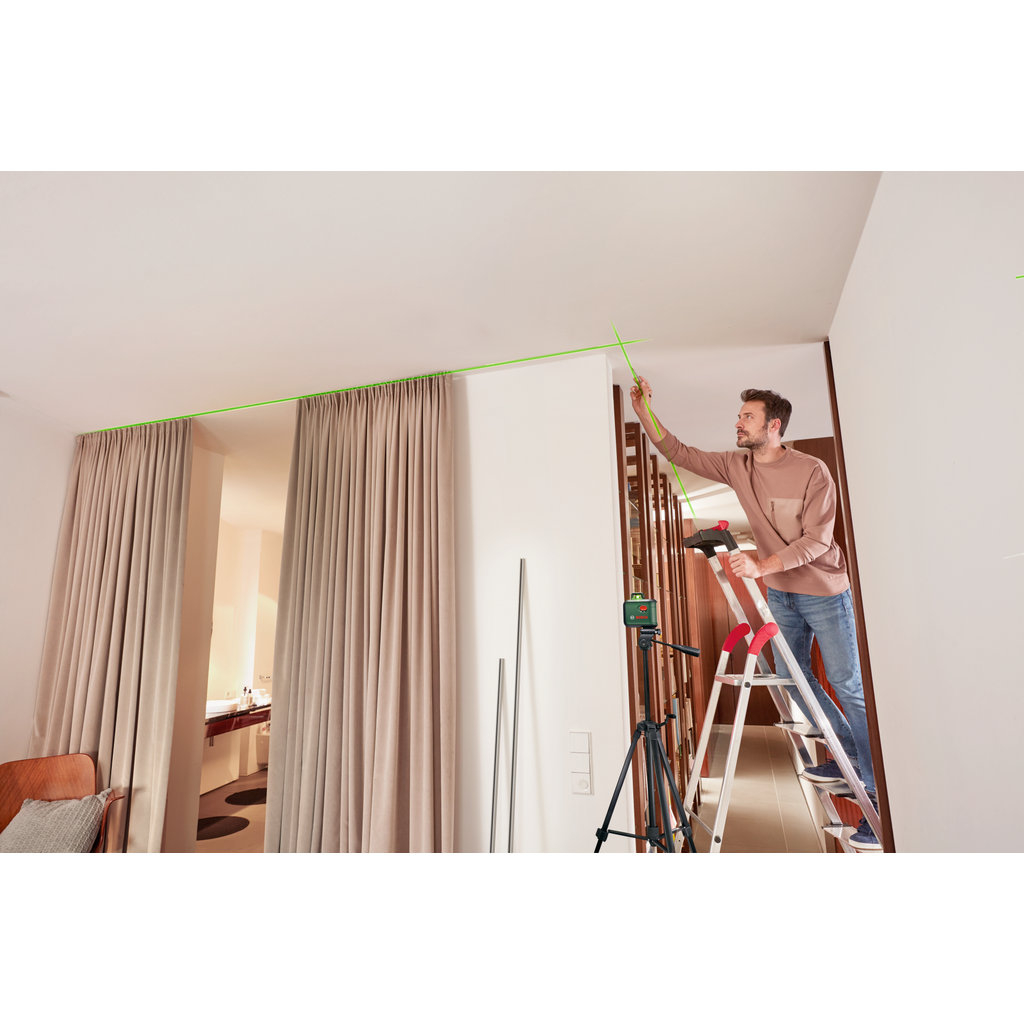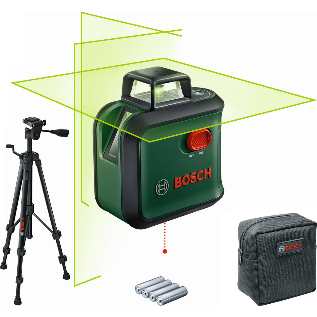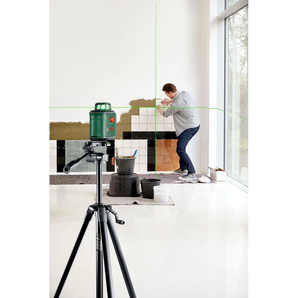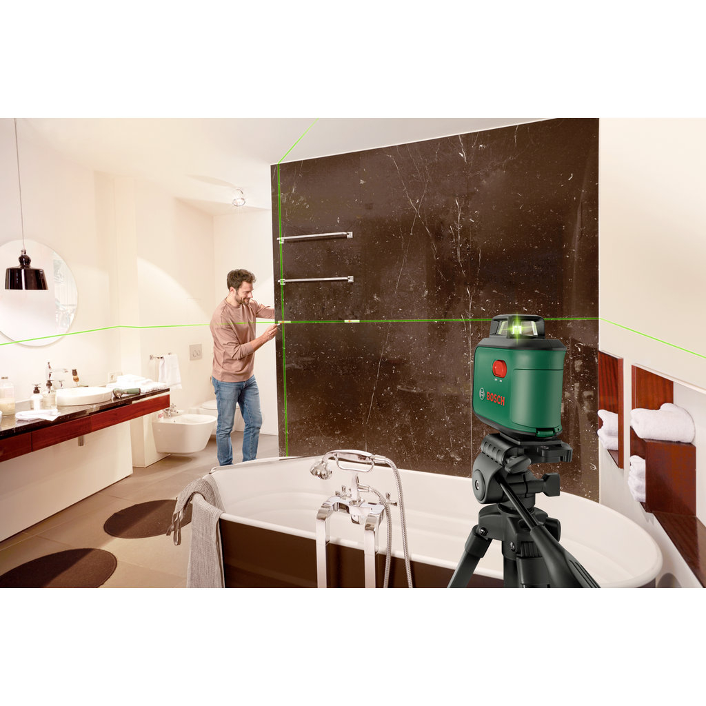 Bosch AdvancedLevel 360 kombinuje všetky funkcie potrebné na rýchle horizontálne, vertikálne a pravouhlé zarovnanie a prenos referencií v jedinom prístroji. Projekcia horizontálnej 360° línie a vertikálnej laserovej línie zaisťuje presné zarovnanie. Okrem toho druhá vertikálna laserová línia pod uhlom 90° umožňuje jednoduché a presné pravouhlé zarovnanie, zatiaľ čo stropný kríž dopĺňa spodný olovnicový bod pre rýchly prenos referencií. Vďaka technológii zeleného lasera je viditeľnosť až štyrikrát lepšia v porovnaní s červenými laserovými čiarami, a to aj za jasných svetelných podmienok. Či už inštalujete podhľady, prenášate nábytok do rovnakej výšky, montujete sadrokartónové dosky a sprchové kúty alebo pripájate svetlá: tento 360° čiarový laser Bosch zaisťuje optimálne výsledky aj na mierne drsných povrchoch.