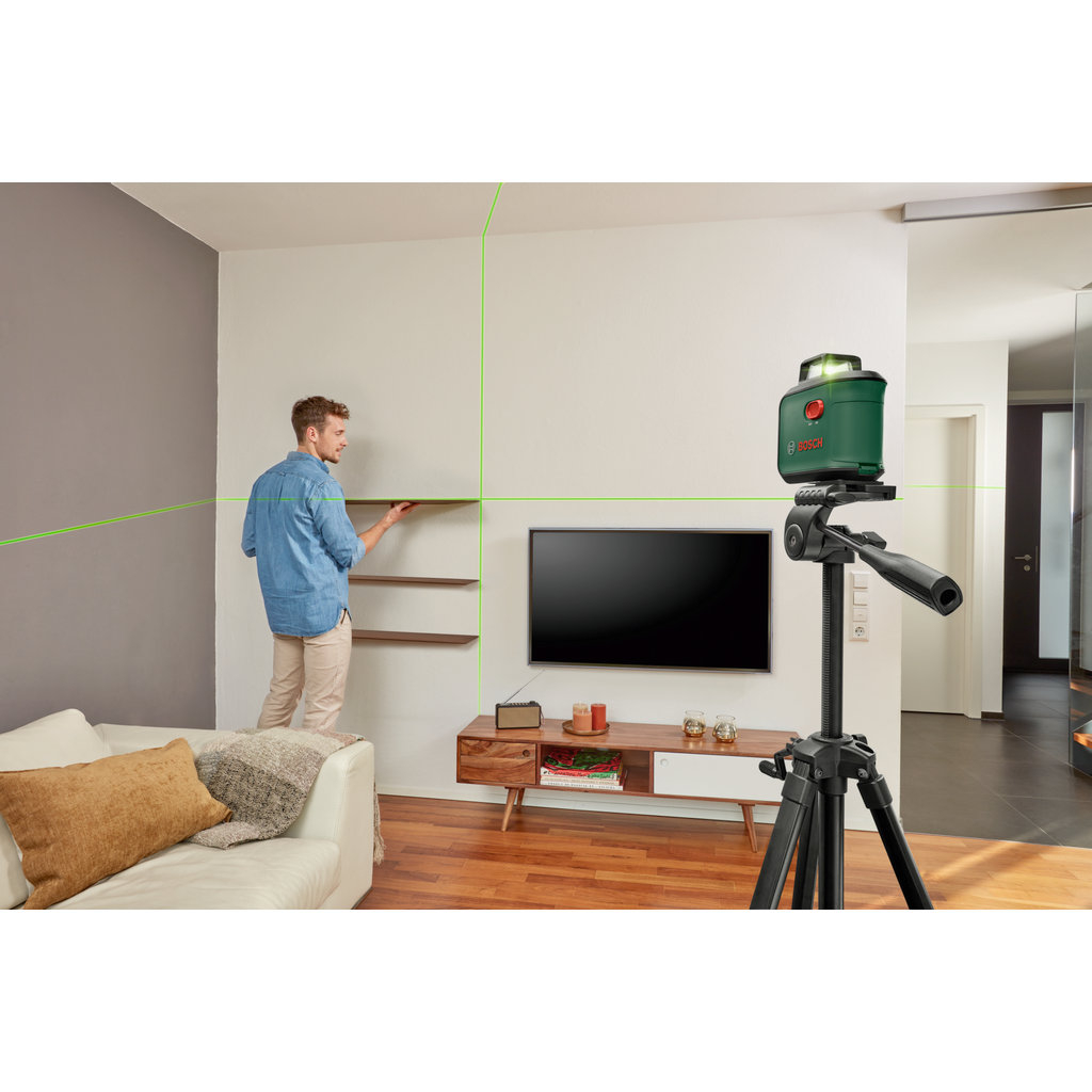 Všestranný laser Bosch AdvancedLevel 360 pre presné vertikálne, horizontálne, pravouhlé vyrovnanie a prenos referencií s maximálnou viditeľnosťou