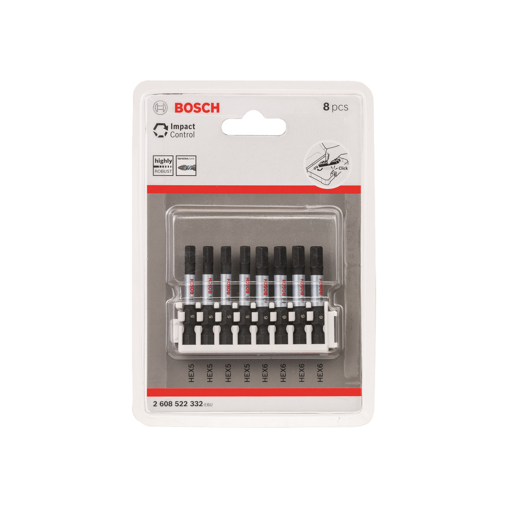 Má 1/4-palcovú šesťhrannú stopku na použitie so štandardnými akumulátorovými vŕtačkami a rázovými uťahovačmi s 1/4-palcovým držiakom SYSTÉM BOSCH PICK AND CLICK Je súčasťou systému Bosch Pick and Click, ktorý umožňuje individuálne zostaviteľné súpravy príslušenstva, vďaka čomu vznikajú kolekcie bitov prispôsobené potrebám. Drážky na zacvaknutie zaisťujú jednotlivo zakúpené balenia bitov, čo umožňuje vytvorenie kolekcie prispôsobenej potrebám a jednoduchú výmenu starých balení.