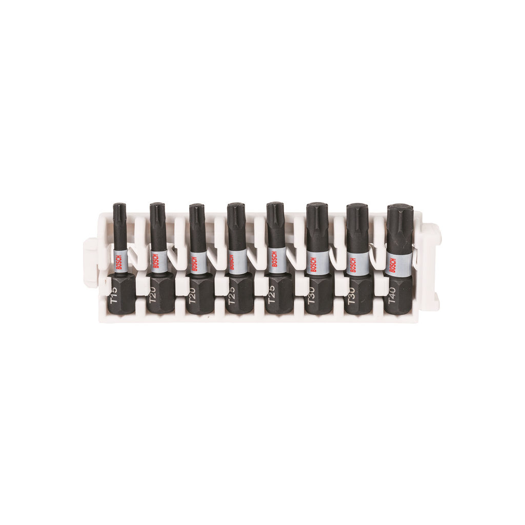 Má 1/4-palcovú šesťhrannú stopku na použitie so štandardnými akumulátorovými vŕtačkami a rázovými uťahovačmi s 1/4-palcovým držiakom SYSTÉM BOSCH PICK AND CLICK Je súčasťou systému Bosch Pick and Click, ktorý umožňuje individuálne zostaviteľné súpravy príslušenstva, vďaka čomu vznikajú kolekcie bitov prispôsobené potrebám. Drážky na zacvaknutie zaisťujú jednotlivo zakúpené balenia bitov, čo umožňuje vytvorenie kolekcie prispôsobenej potrebám a jednoduchú výmenu starých balení.