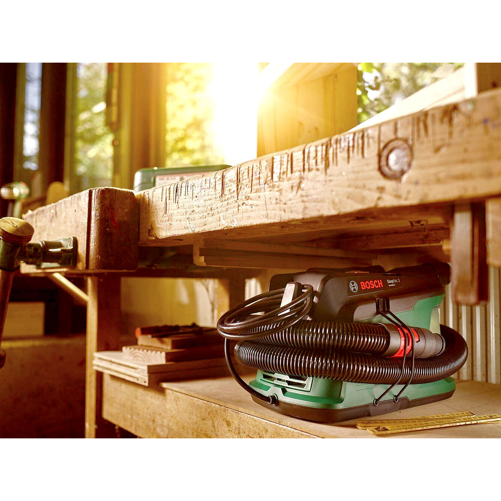 Vychutnajte si s vysávačom Bosch EasyVac 3 bezstarostné čistenie, jednoduchý transport a ľahké skladovanie. Všetky káble a hadicové príslušenstvo pripojíte priamo na vysávač na ľahké a pohodlné skladovanie. Prenášanie a skladovanie tohto vysávača uľahčuje praktická rukoväť. Vysáva suché i ťažko prístupné nečistoty v dielni, doma alebo v aute. Tento vysávač umožňuje priame pripojenie ku ktorémukoľvek náradiu Bosch Home & Garden a elektrickému náradiu iných výrobcov, a to vďaka flexibilnému univerzálnemu adaptéru a jeho kónickému tvaru. Automaticky sa zapína a vypína v synchronizácii s náradím, výrazne zlepšuje ovládanie a znižuje čas potrebný na čistenie.