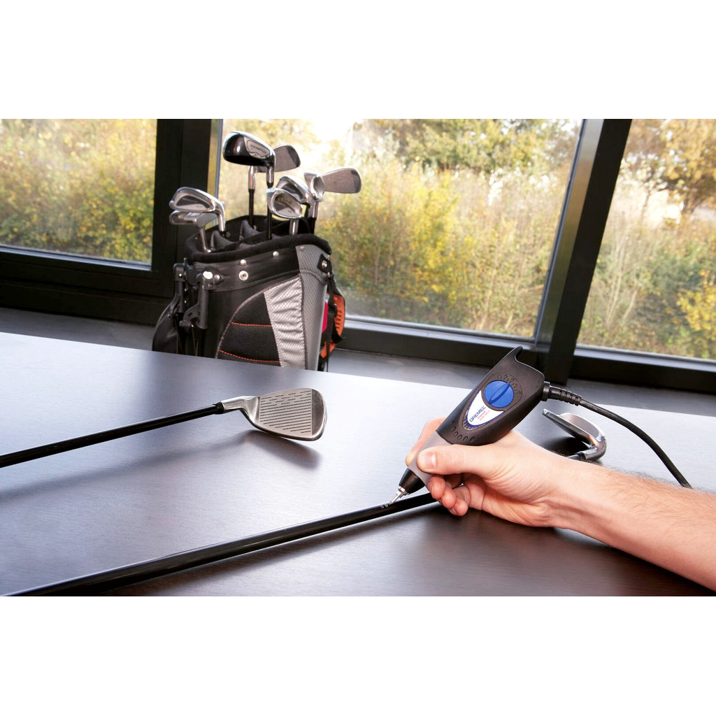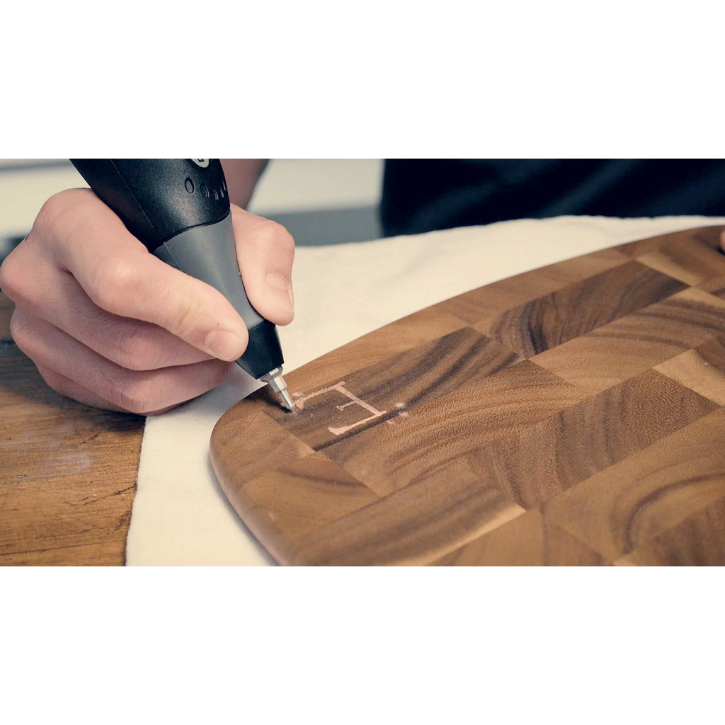 Samostatný vypínač na udržanie nastavenej hĺbky Gravírovačka Dremel Engraver s vratným pohybom a premenlivou hĺbkou rázu umožňuje používateľovi gravírovať alebo dekorovať pomocou karbidových a diamantových hrotov širokú paletu materiálov od kože po sklo. Gravírovanie a dekorácia širokej palety materiálov ako kovy, plasty, sklo, keramika, drevo a koža. Spolu so šablónou na pohodlné gravírovanie písmen a číslic. Táto ergonomická, ľahká gravírovačka zvládne všetky vaše gravírovacie práce s ľahkosťou a maximálnou presnosťou. Súprava obsahuje aj gravírovacie šablóny, ktoré vám umožnia gravírovať špeciálne tvary do ľubovoľného materiálu, ako sklo, kov, plasty, keramika, drevo a koža. Takto môžete vytvárať osobné darčeky, ako ozdobné drevené dosky, sviečky, rámy na obrazy a poháre na šampanské.