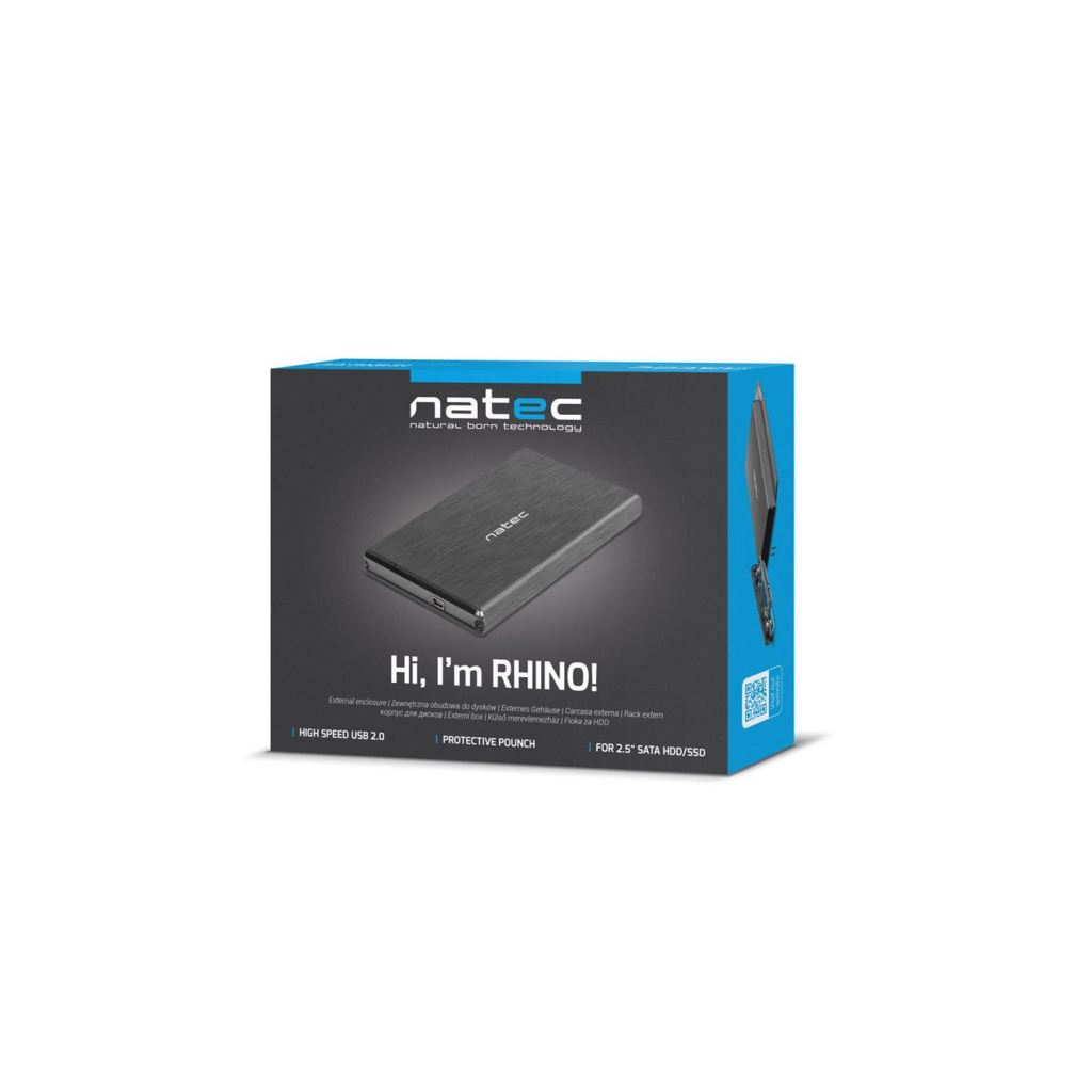 Externý HDD box Natec Rhino s rozhraním USB 2.0 chráni váš disk pred poškodením a ponúka rýchly prenos dát až do 480 Mb/s.Box podporuje 2,5" HDD aj SSD disky s rozhraním SATA, maximálnou kapacitou do 4 TB a hrúbkou 9,5 mm.
