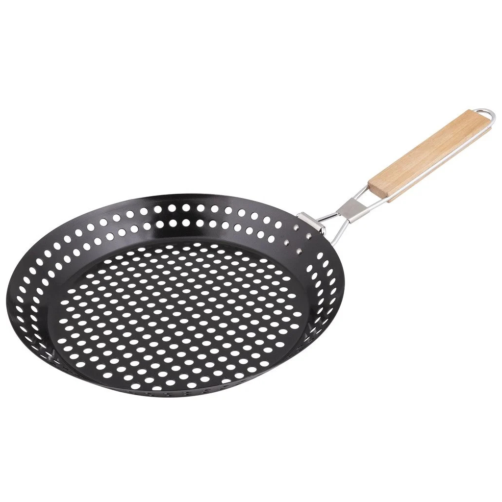 Táto grilovacia panvica je ideálna na grilovanie rýb, mäsa a zeleniny. Je vyrobená z nehrdzavejúcej ocele. Vďaka nepriľnavému povrchu sa grilované pokrmy z panvice ľahko vyberajú.Praktická je sklopná drevená rukoväť s kovovým rámom a pútkom na zavesenie. Špecifický dizajn panvice s otvormi zabezpečuje rovnomerné grilovanie potravín a pomáha rozvíjať chute typické pre grilovanie.
