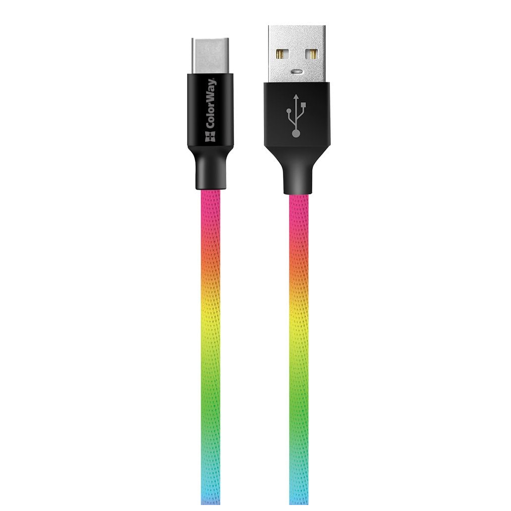 ColorWay USB 2.0 typ A na USB typ C, 1 m, Rainbow multicolorKabel s kvalitním textilním opletením vhodný pro připojení zařízení s konektorem USB typ C k počítači. Podporuje nabíjení proudem až 2,4 A.