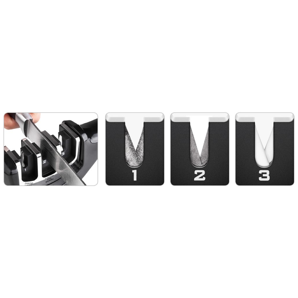 Multifunkčný brúsič na oceľové a keramické nože. Brúska je vybavená 3 čepeľami. Diamantová čepeľ je určená na ostrenie keramických nožov. Čepeľ z karbidu volfrámu je určená na ostrenie oceľových nožov. Keramická čepeľ je určená na ostrenie nožov.Telo brúsky je vyrobené z tvrdého ABS plastu a je vybavené ergonomicky tvarovanou, pohodlnou rukoväťou s protišmykovou základňou, ktorá zabezpečuje bezpečné uchopenie počas ostrenia. Brúsne kotúče nie je možné vymeniť