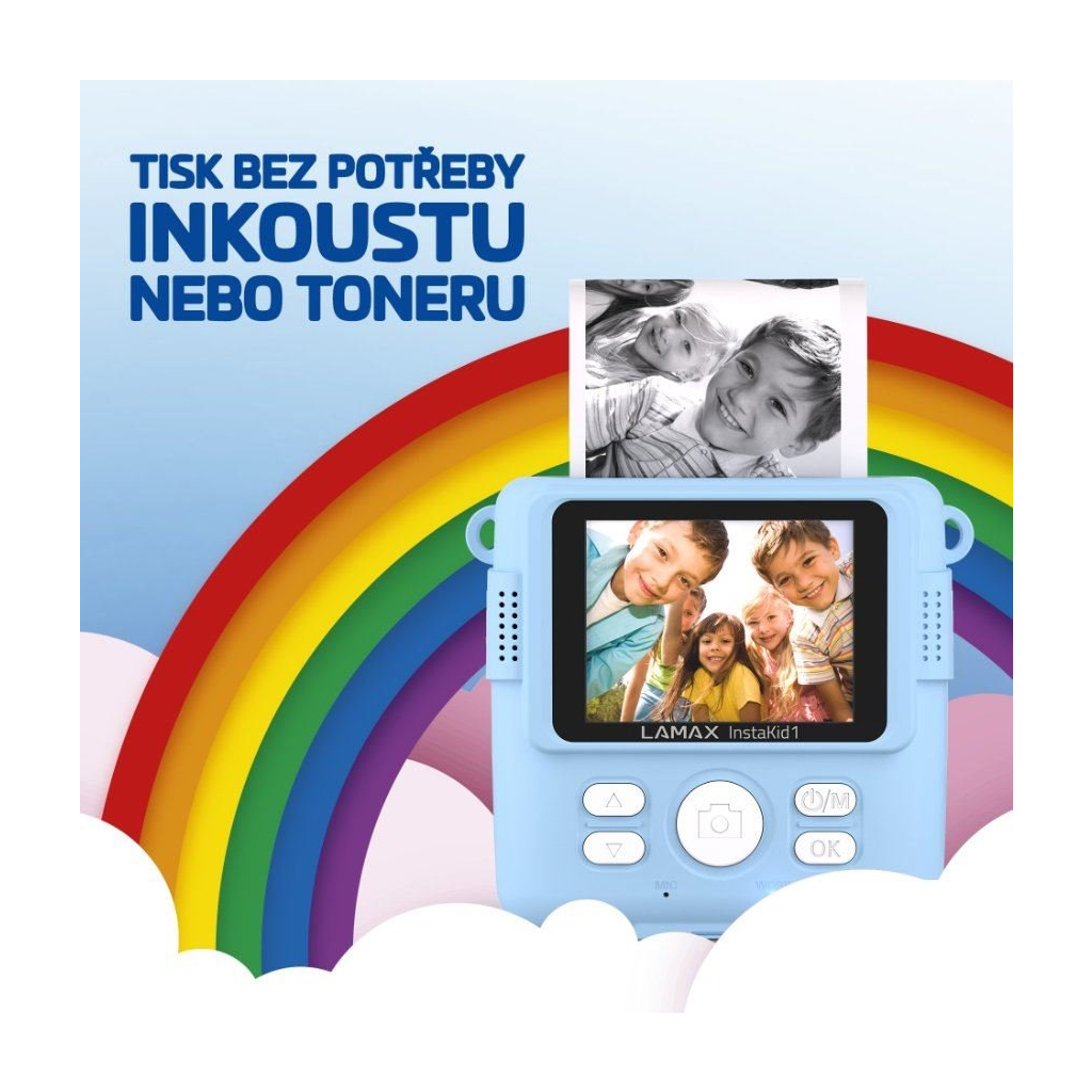 Detský fotoaparát LAMAX InstaKid1 dokonale zdokumentuje každý okamih, ktorý si chcete uchovať. Urobte skvelé fotografie so svojimi kamarátmi a vytlačte ich, aby si ich každý mohol zapamätať. V priebehu niekoľkých sekúnd máte originálnu fotografiu v odtieňoch sivej. Stačí vložiť termopapier a môžete začať, na okamžitú tlač nie je potrebný toner ani atrament. Jedna rolka sa rovná 80 parádnym fotografiám a v balení dostanete dve. Dokonca si môžete vyrobiť aj nálepku. Stačí použiť samolepiaci termopapier, z ktorého vytvoríte 30 nálepiek. Okrem fotografií, ktoré si môžete uložiť na kartu microSD s rozlíšením až 8 MP, urobíte aj parádne videá. Na kartu ich uložíte buď v interpolovanom rozlíšení 1080p, alebo v skutočnom rozlíšení 720p.