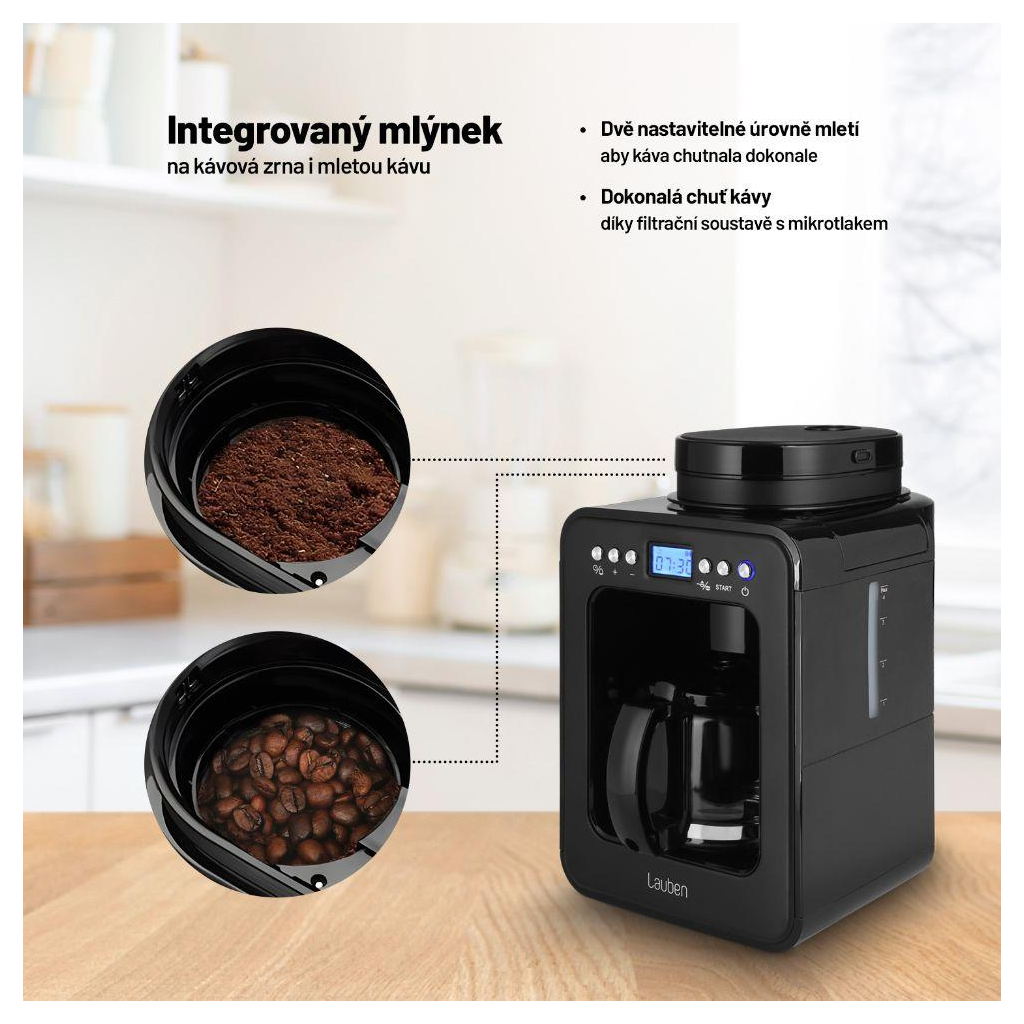 Kávovar Lauben Grind&Drip 600BB má zabudovaný mlynček, ktorý namelie kávové zrná na požadovanú hrubosť, a to v 2 úrovniach času mletia. Z pomletých zŕn potom pripraví odkvapkávanú kávu. Na prípravu však možno použiť aj klasickú mletú kávu, súčasťou balenia je aj praktická odmerka.
