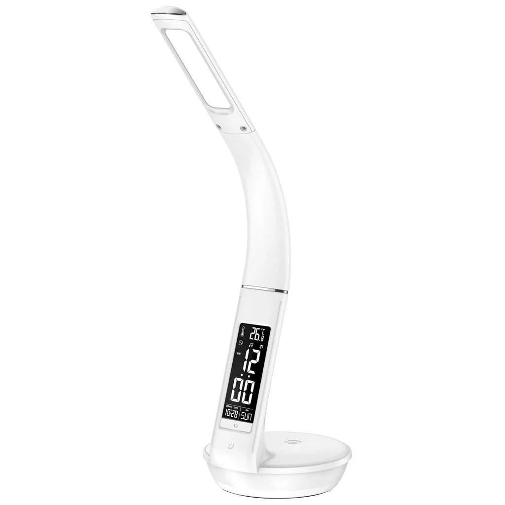 Stolná LED lampa s ambientným podsvietením, hodinami, kalendárom, teplomerom, bezdrôtovým nabíjaním Qi a výstupom USB.