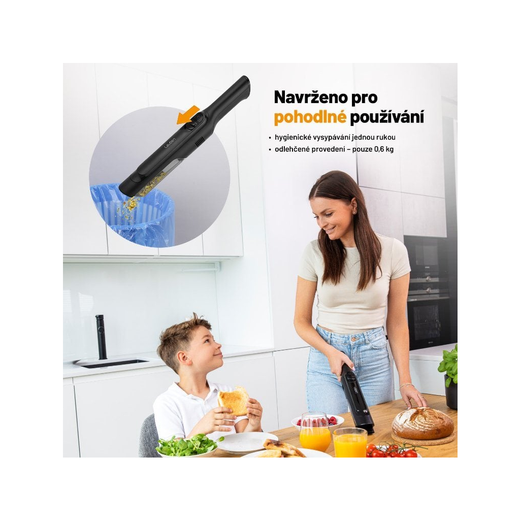 Ručný vysávač sa môže pochváliť prémiovým matným čiernym povrchom s lesklými prvkami, ľahkou konštrukciou a zbernou nádobou umiestnenou na hornej strane, takže neprekáža pri upratovaní ani v úzkych priestoroch.