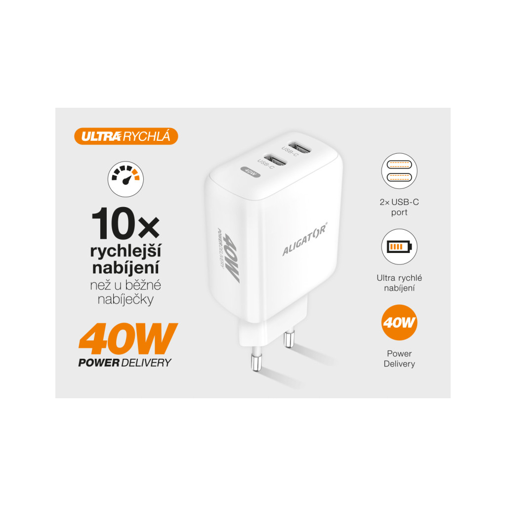 Rýchlonabíjačka ALIGATOR, PD 40W 2xUSB-C, biela