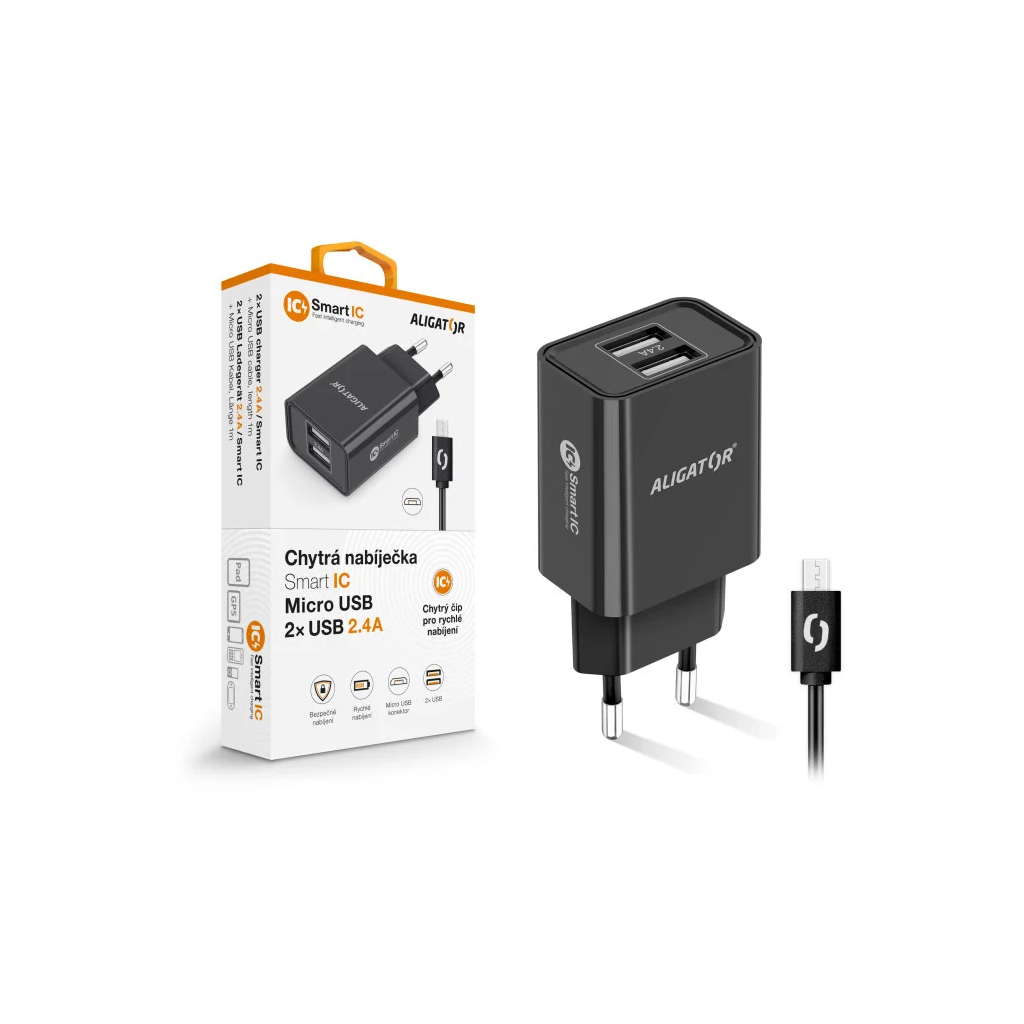 Chytrá sieťová nabíjačka ALIGATOR 2,4A, 2xUSB, inteligentný IC, čierna, kábel Micro USB 2A