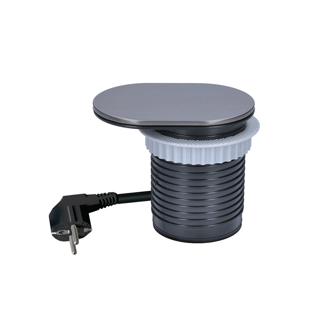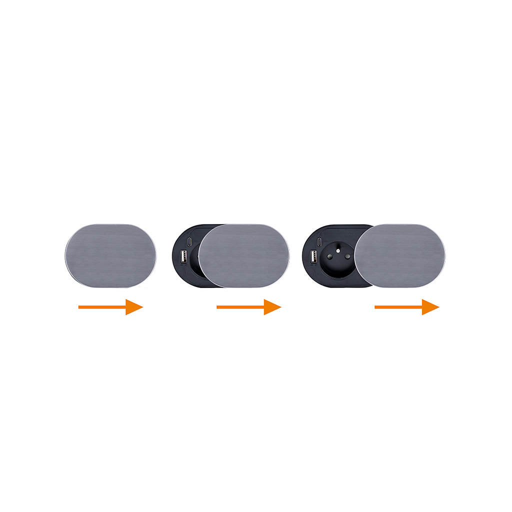 Posuvné viečko v matnom nerezovom prevedení pôsobí elegantne a nenápadne. Posuvný mechanizmus chráni zásuvku aj nabíjacie porty pred prachom a nečistotami. Navyše je možné odhaliť len USB porty a sieťovú zásuvku ponechať zakrytú. Zakryté viečko zachováva čistý vzhľad pracovnej plochy.