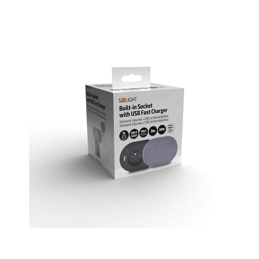 Solight 1z + USB A+C 20W PD vstavaná zásuvka s posuvným viečkom, 2m, strieborná + DARČEK Delta Plus Zátky do uší 1 pár CONICPLUS001