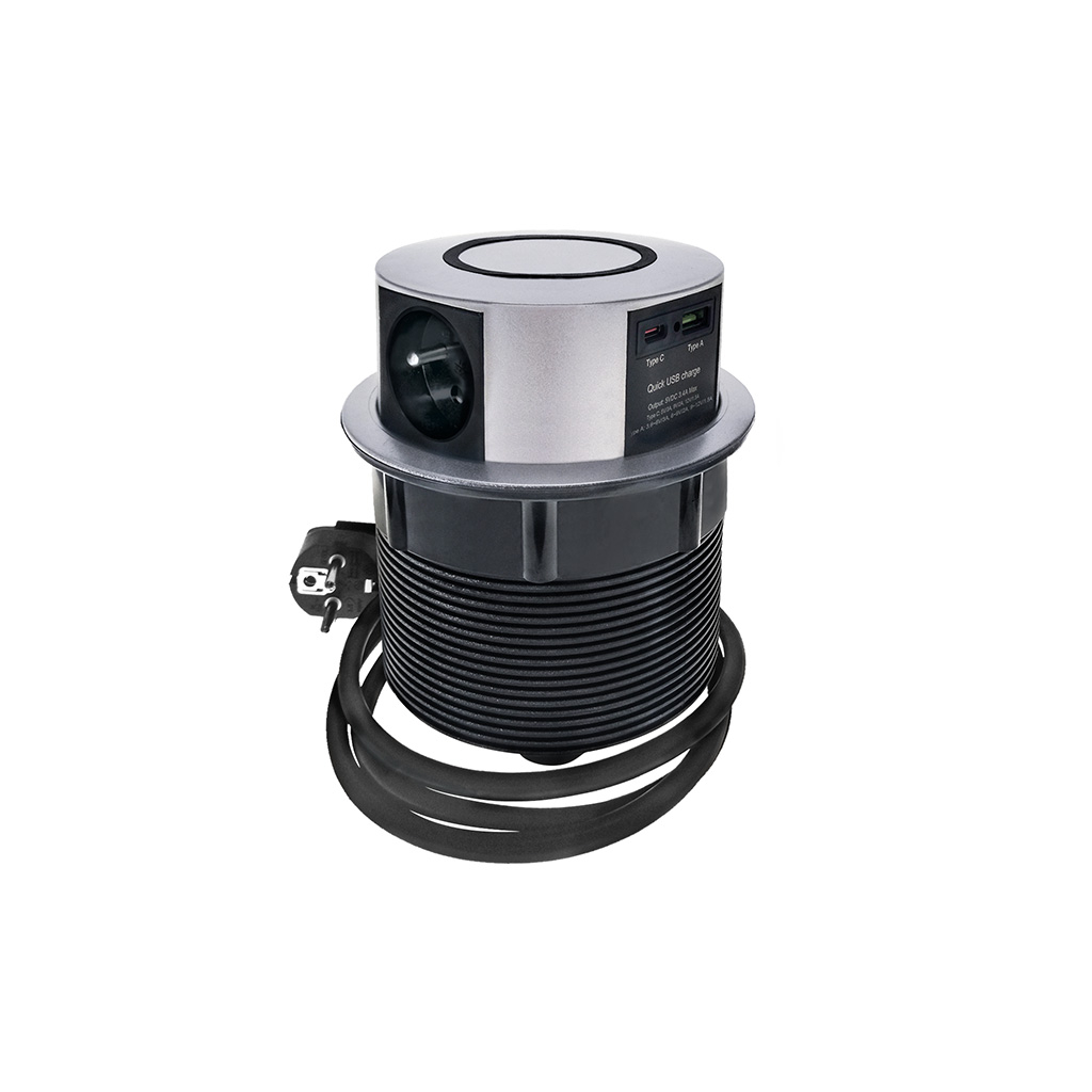 Tento výsuvný blok zásuviek prináša všetko potrebné pre modernú pracovnú plochu. Tri sieťové zásuvky 230V, USB-A a USB-C porty s rýchlym nabíjaním a integrovaná bezdrôtová nabíjačka s výkonom až 10 W tvoria kompaktné riešenie pre každodenné používanie. Strieborné prevedenie vrchného krytu elegantne zapadne do pracovného stola, kuchynskej linky alebo konferenčnej miestnosti.