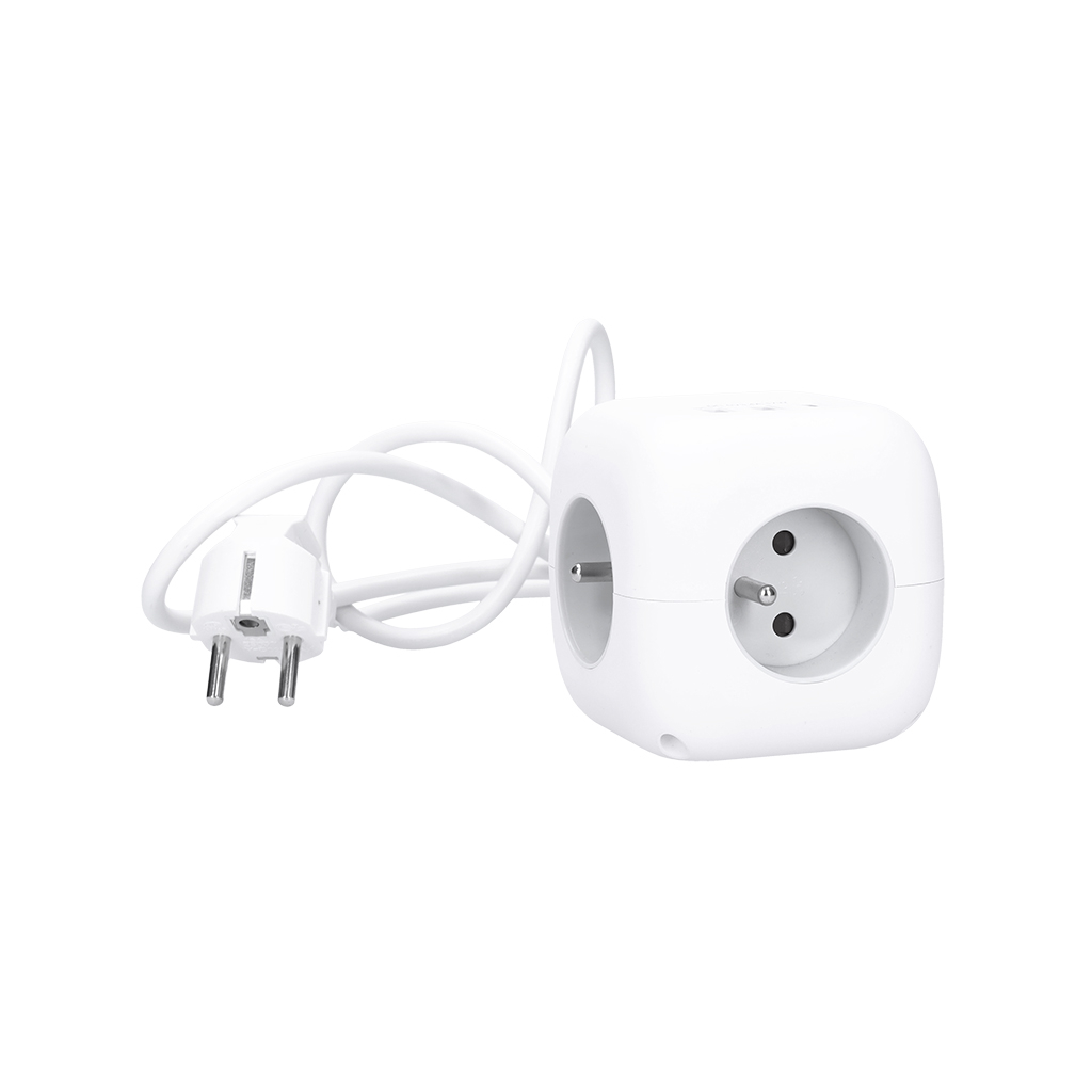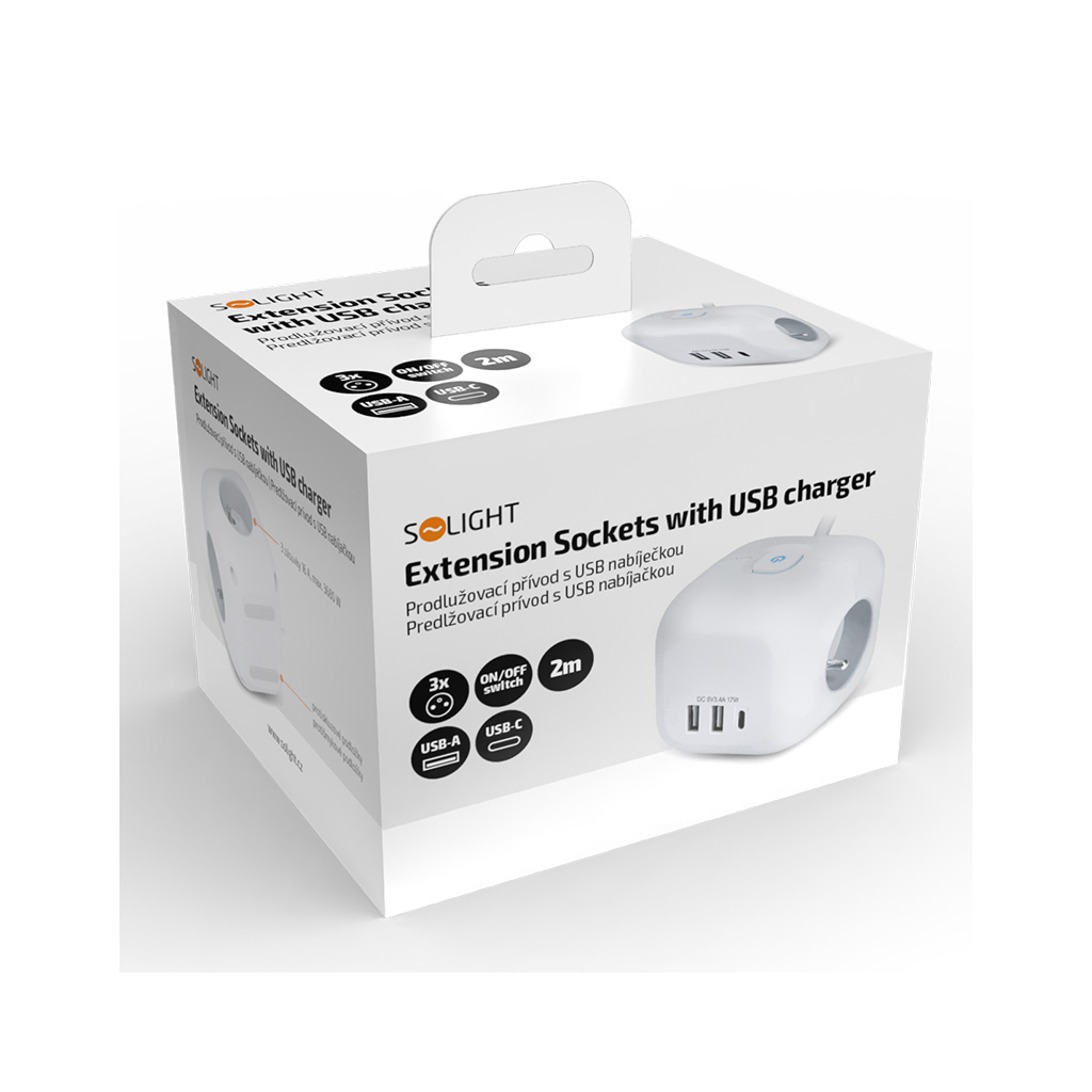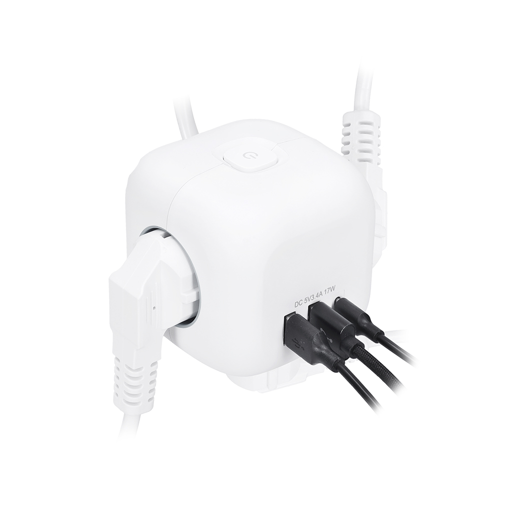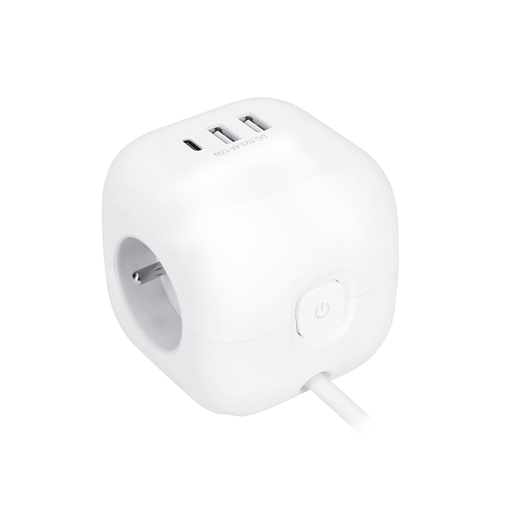 Predlžovací prívod v tvare kocky s dĺžkou strany 8 cm spája tri uzemnené zásuvky s detskou poistkou a USB nabíjačku s portami USB-C a USB-A. Vďaka 2m dlhému káblu poskytuje flexibilné využitie. Protišmykové podložky udržujú prívod stabilný na stole alebo pracovnej ploche. Podsvietený vypínač umožňuje jednoduché ovládanie všetkých zásuviek aj USB portov.