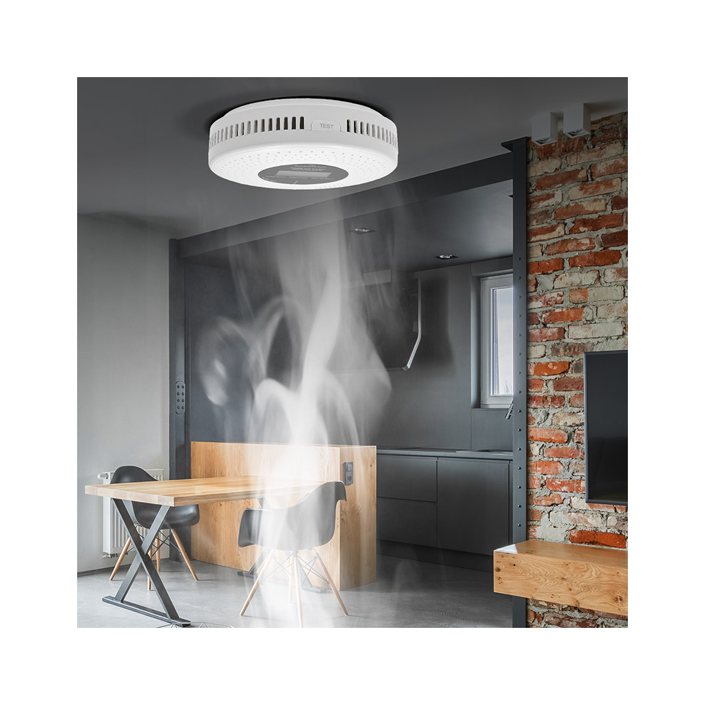 Kombinovaný detektor dymu a oxidu uhoľnatého - maximálna bezpečnosť. Tento detektor poskytuje včasné varovanie pred prítomnosťou dymu aj oxidu uhoľnatého kombináciou fotoelektrického a elektrochemického snímača. Ponúka dlhú životnosť, nízku spotrebu energie a hlasný alarm (85 dB) doplnený displejom LCD a svetelným signálom. Samodiagnostika monitoruje správnu funkciu zariadenia. Napájaný 2x batériami AA s upozornením na slabé batérie. Spĺňa prísne bezpečnostné normy.