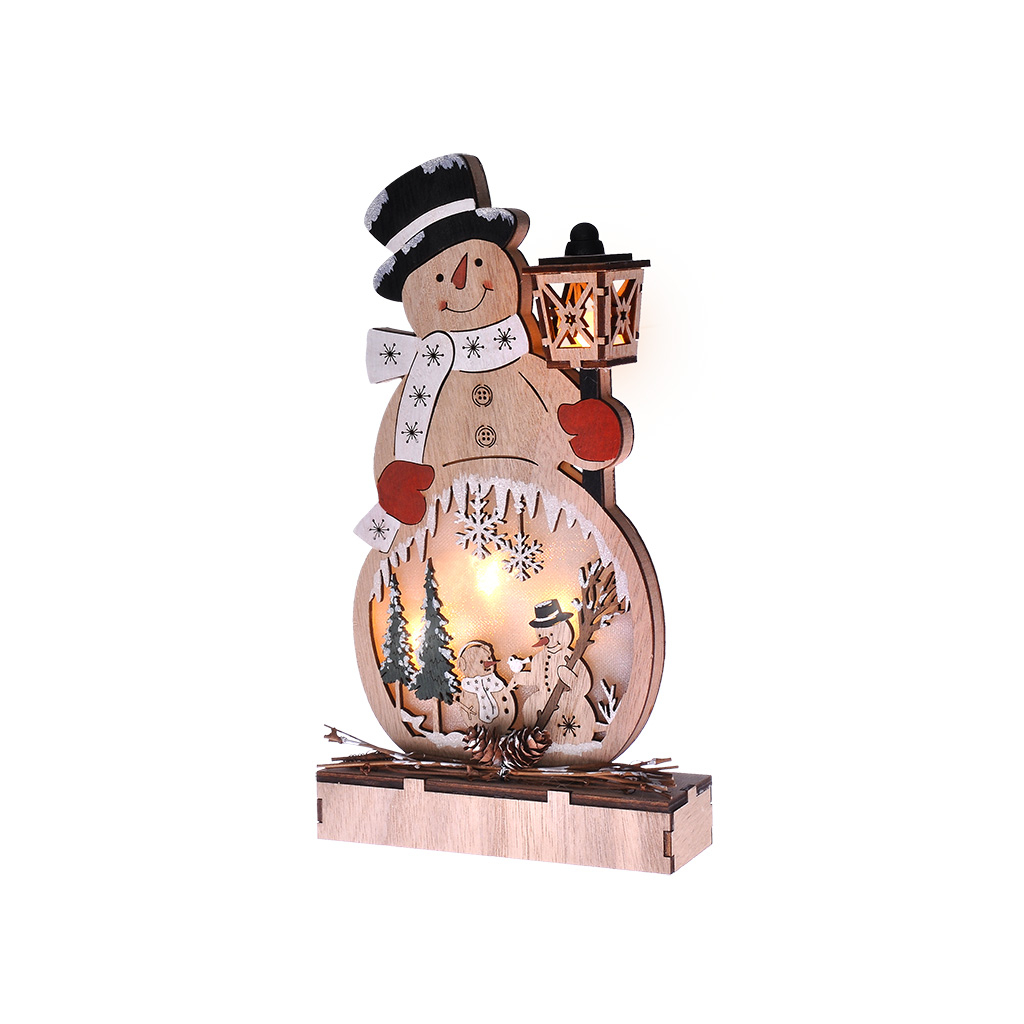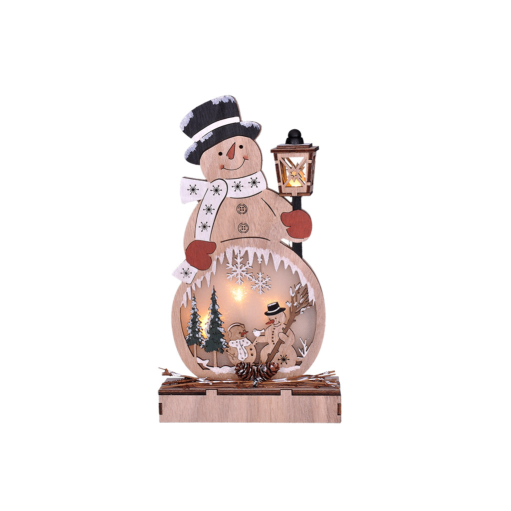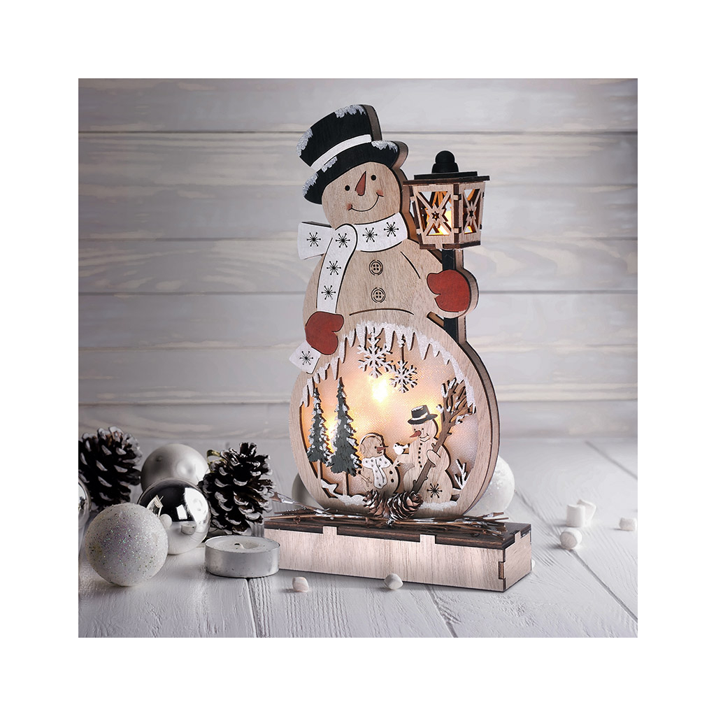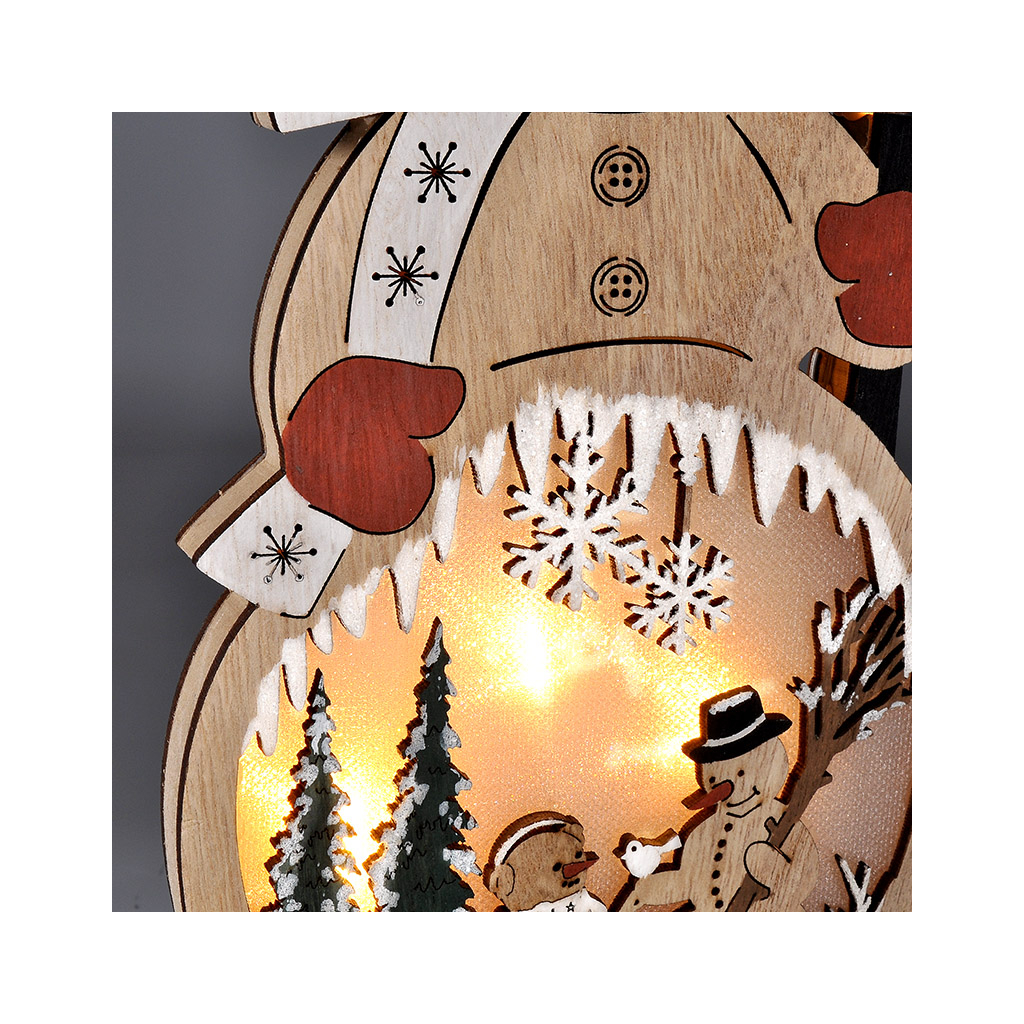 Drevená dekorácia v tvare snehuliaka s LED osvetlením je hravým doplnkom vianočných dekorácií. Je vyrobená z prírodného dreva a vybavená štyrmi LED diódami v teplej bielej farbe a v každom interiéri vytvorí príjemnú atmosféru. Má rozmery 29 × 16 × 5 cm a je ideálna na vystavenie na komode, parapete alebo poličke.