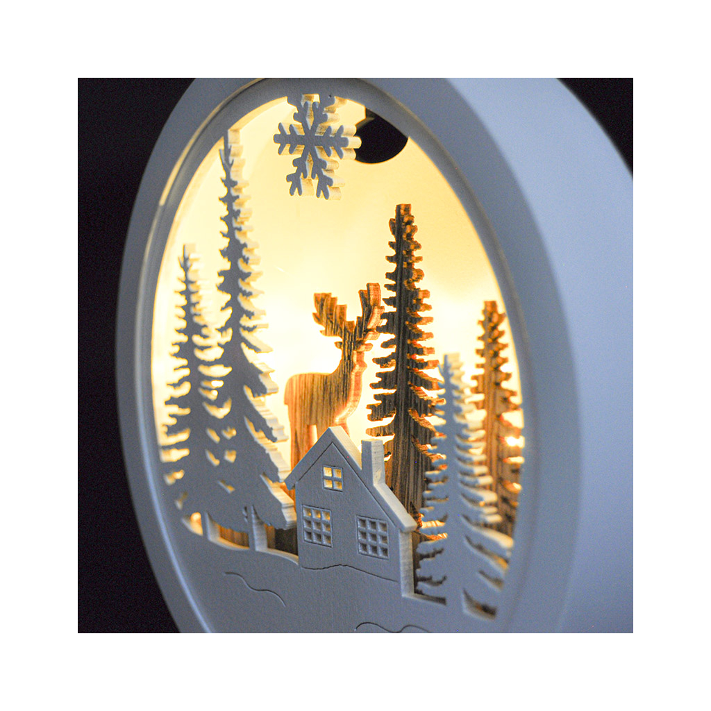 Minimalistická LED dekorácia v kombinácii bielej farby a prírodného dreva zobrazuje zimnú lesnú scénu s jeleňmi a stromami. Vo vnútri sa nachádzajú 4 LED diódy s teplým bielym svetlom, ktoré navodzujú príjemnú večernú atmosféru. Vďaka kompaktným rozmerom 14 × 14 × 2,5 cm je dekorácia ideálna na zavesenie na stenu, do okna alebo ako dekorácia na poličku.