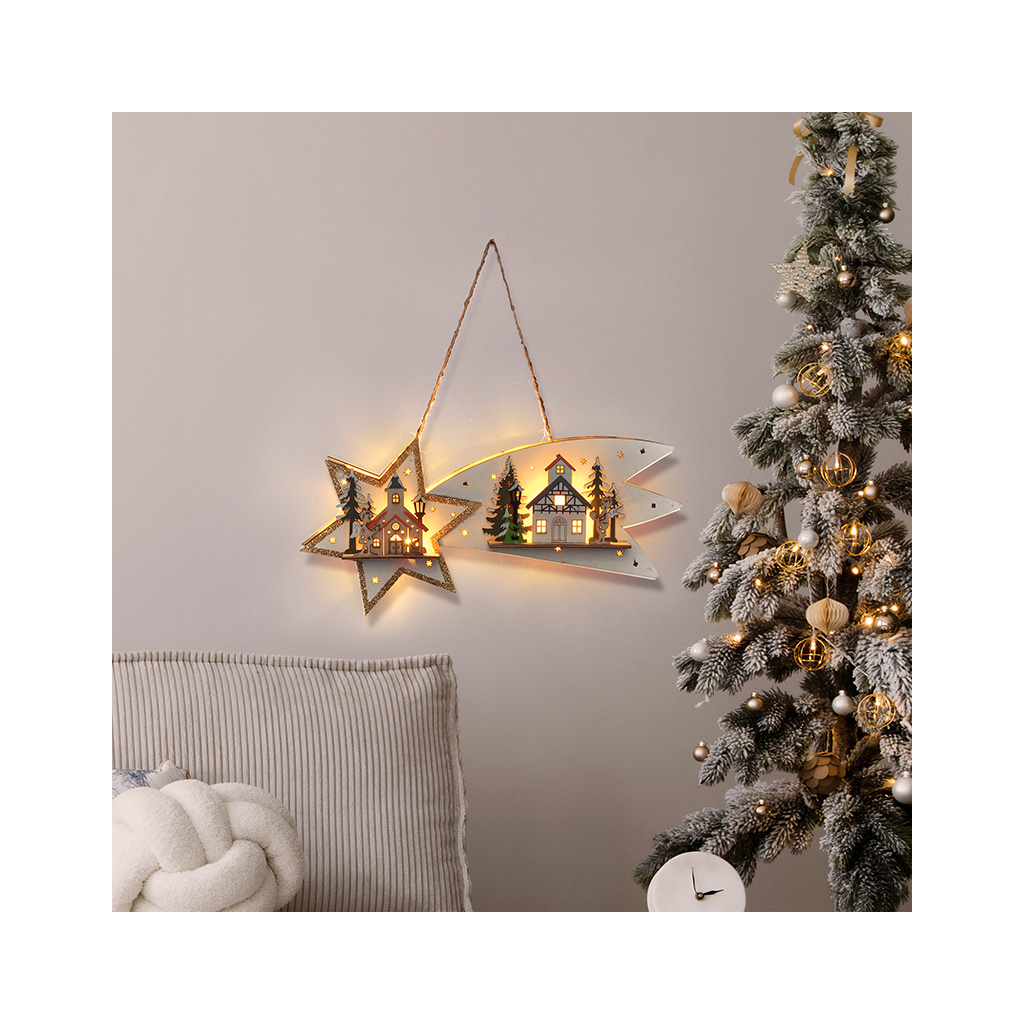 Elegantná drevená dekorácia v tvare vianočnej kométy s 10 LED diódami krásne doplní vašu zimnú výzdobu. Teplé biele svetlo osvetľuje celý tvar kométy a vytvára efekt padajúcej hviezdy. Vďaka rozmerom 31 × 6 × 14 cm a praktickému závesnému pútku ju ľahko umiestnite na dvere, stenu alebo okenný rám.