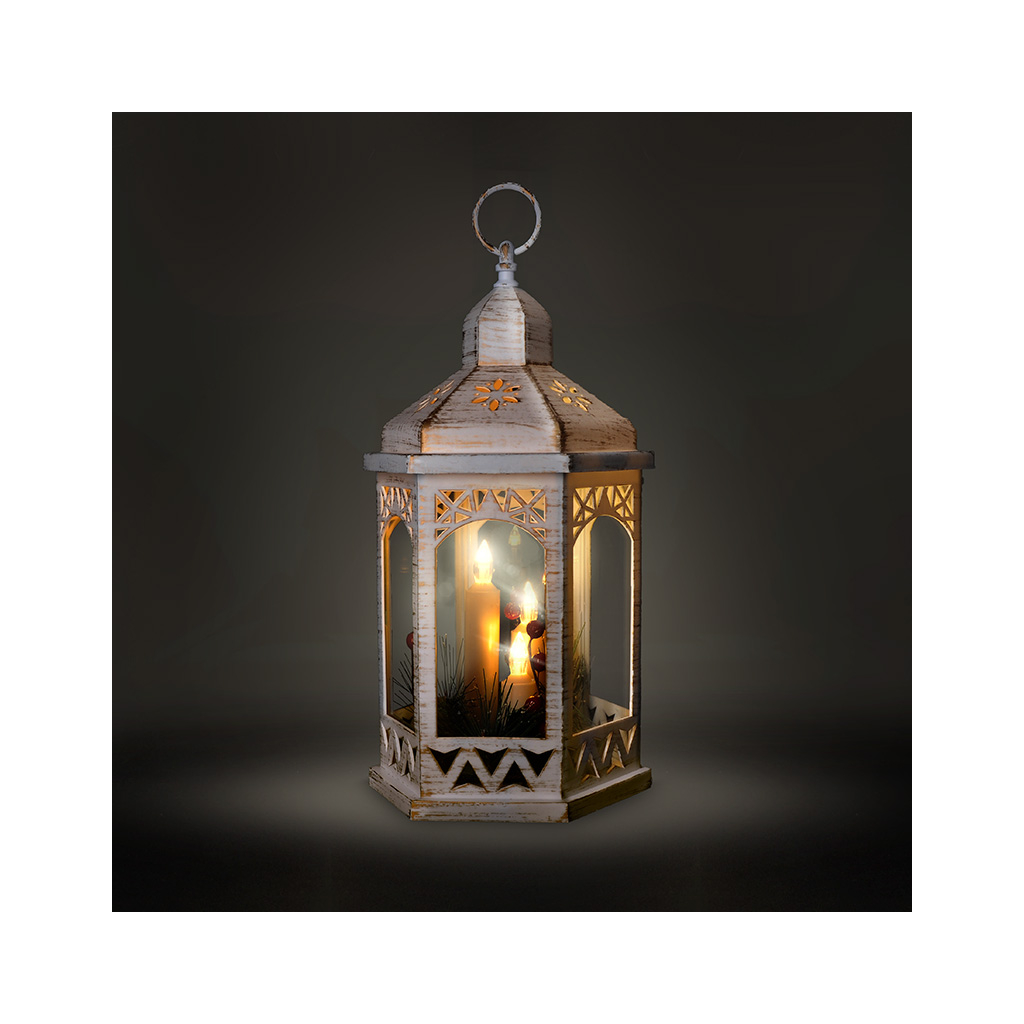 - vianočný lampáš biely s tromi LED sviečkami a dekoráciami