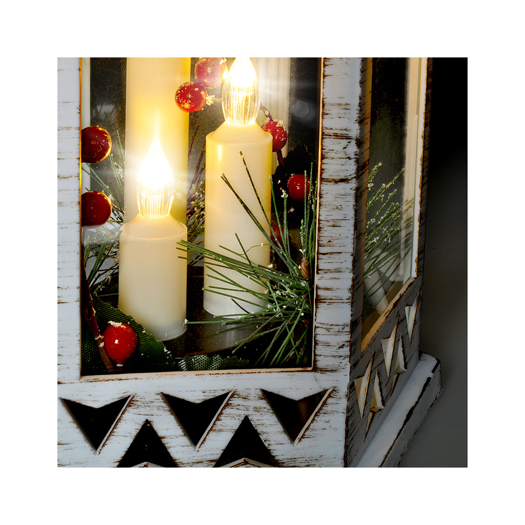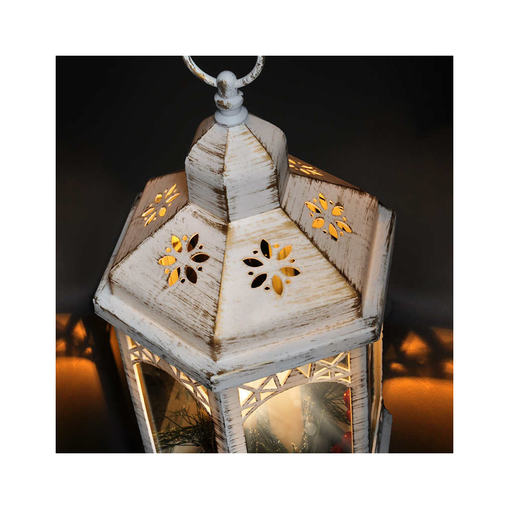 Biely vianočný lampáš so sviečkami LED je čarovným doplnkom na zimné večery. Tri sviečky vo vnútri lampáša sú osvetlené trojicou teplých bielych LED diód, ktoré napodobňujú efekt skutočného plameňa a vytvárajú romantickú a pokojnú atmosféru. Ozdoby vo vnútri lampáša ho robia ešte autentickejším a navodzujú pocit skutočných sviatkov.