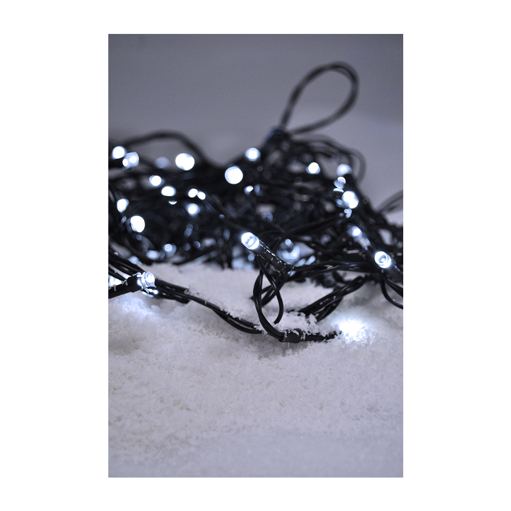 Reťaz LED so 100 studenými bielymi diódami LED prináša moderné, elegantné osvetlenie, ktoré je ideálne pre zimné a sviatočné dekorácie. Chladné svetlo vytvára čistý a sofistikovaný dojem, ktorý je ideálny na kombinovanie s bielymi alebo striebornými dekoráciami. LED diódy sú rozmiestnené v 10 cm intervaloch a dĺžka osvetlenia je 10 metrov, čo zaručuje rovnomerné pokrytie priestoru svetlom.