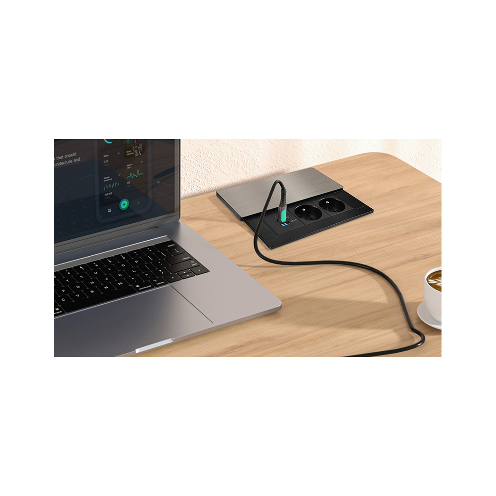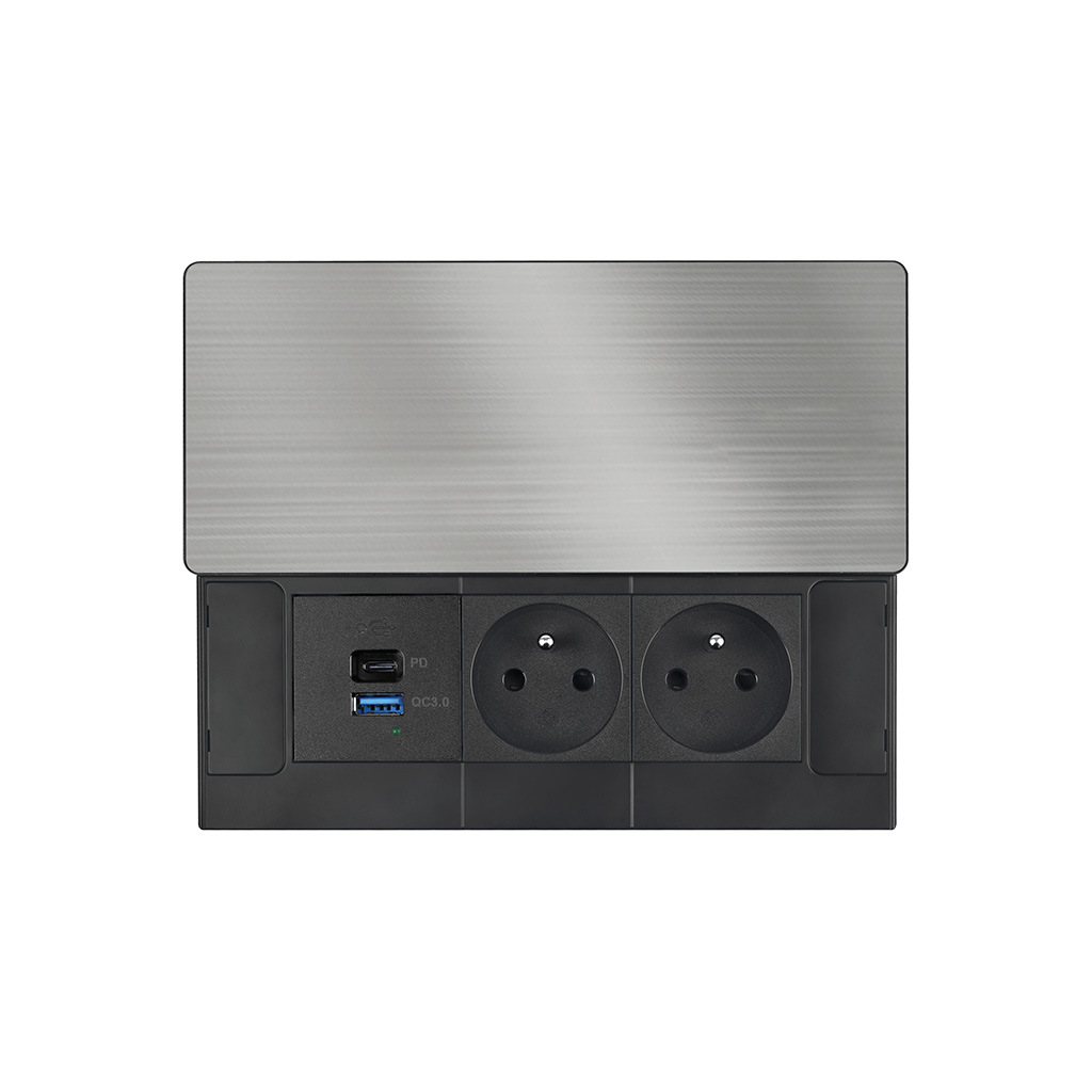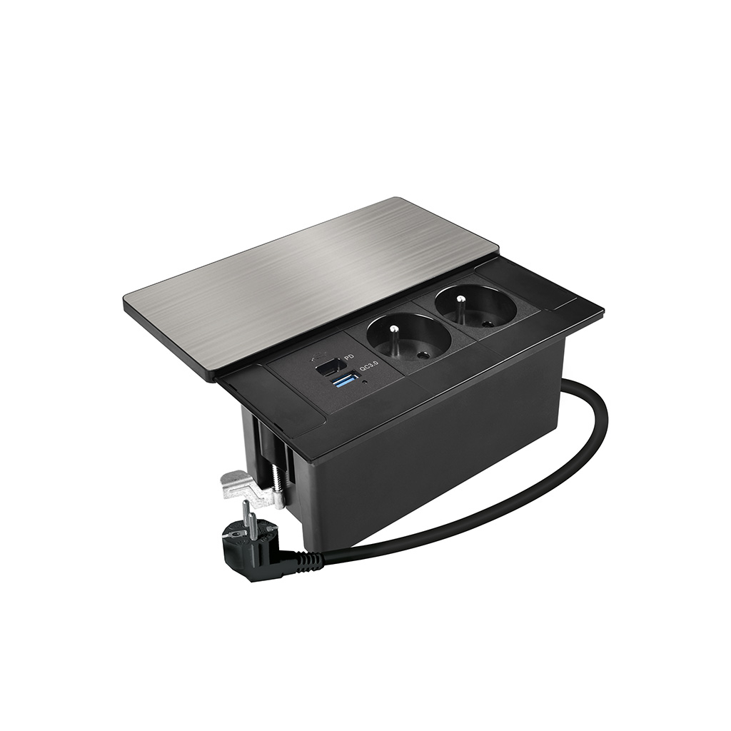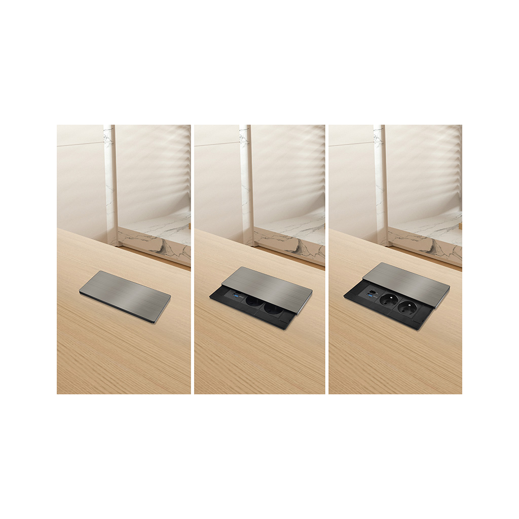 Vrchný kryt z matnej tmavej nerez ocele (inox) pôsobí elegantne a prirodzene zapadne do moderného interiéru. Nízky profil, čisté línie a nenápadné posuvné otváranie zachovávajú vzhľad pracovnej plochy. Zásuvky aj nabíjacie porty sú kedykoľvek ľahko prístupné jednoduchým pohybom ruky.