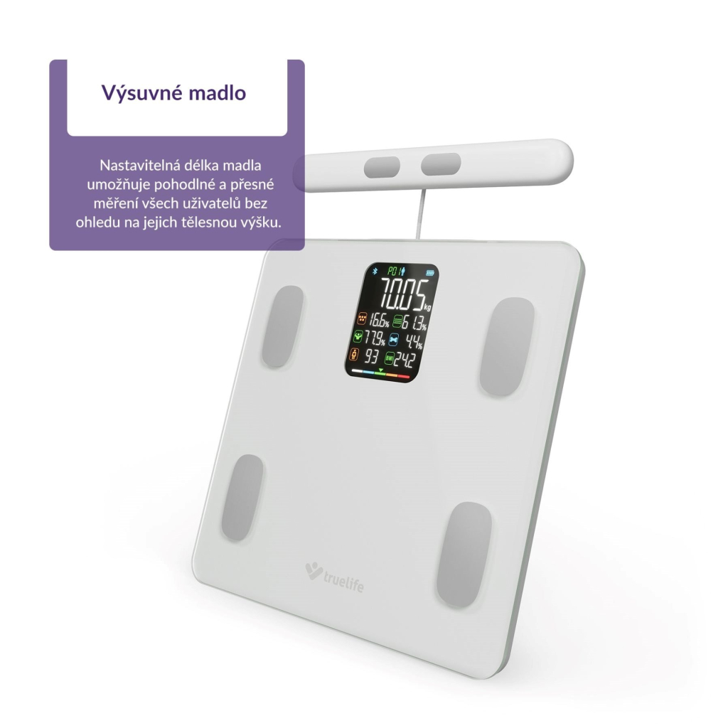 Vďaka 8 vysoko citlivým snímačom a technológii TrueLife PrecisionIQ+® vám váha TrueLife Fitscale W8 White umožňuje merať celé telo - od nôh až po ruky. Váha tak poskytuje komplexné výsledky, ktoré bežné váhy so 4 snímačmi nemôžu ponúknuť. Špičkové snímače dopĺňajú pokročilé algoritmy a inteligentná analýza údajov na presné a spoľahlivé merania. Výsledkom je podrobné posúdenie telesnej stavby vrátane zdravotných ukazovateľov, ktoré je rýchlejšie a presnejšie ako pri tradičných váhach. Bioelektrická impedančná analýza (BIA) vám ukáže pomer svalovej hmoty, tuku, vody, kostí k celkovej hmotnosti. Na prehľadnom LCD displeji môžete okamžite vidieť 7 telesných indexov a aplikácia ponúka úplnú správu s 15 podrobne vysvetlenými indexmi. Môžete napríklad zistiť svoj metabolický vek, zastúpenie bielkovín a minerálov v tele, BMI alebo somatotyp.
